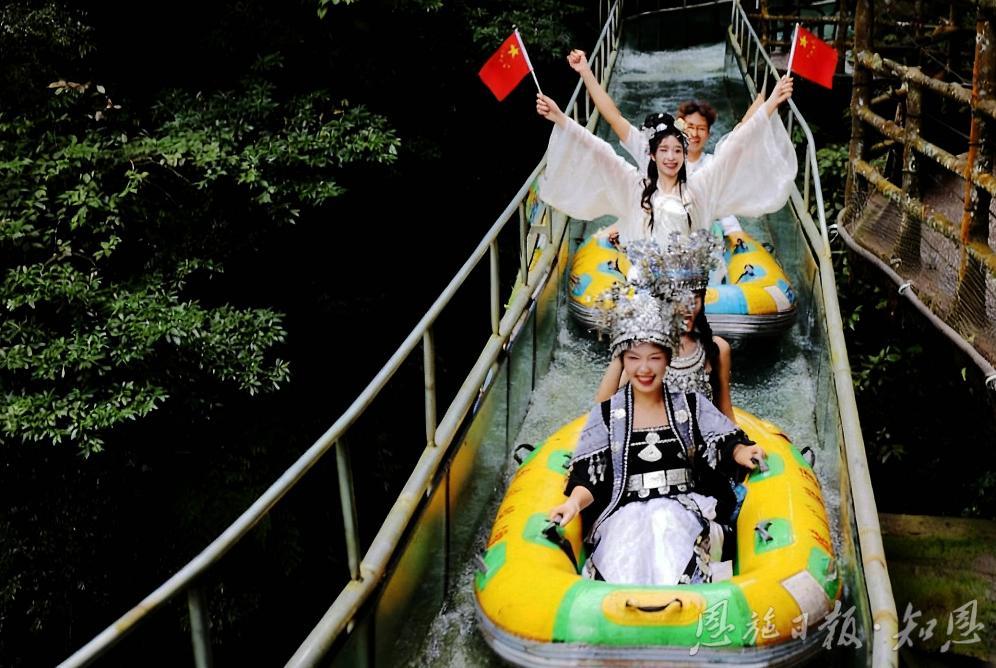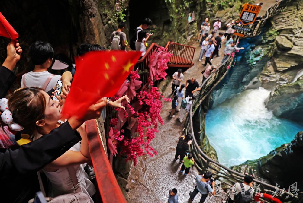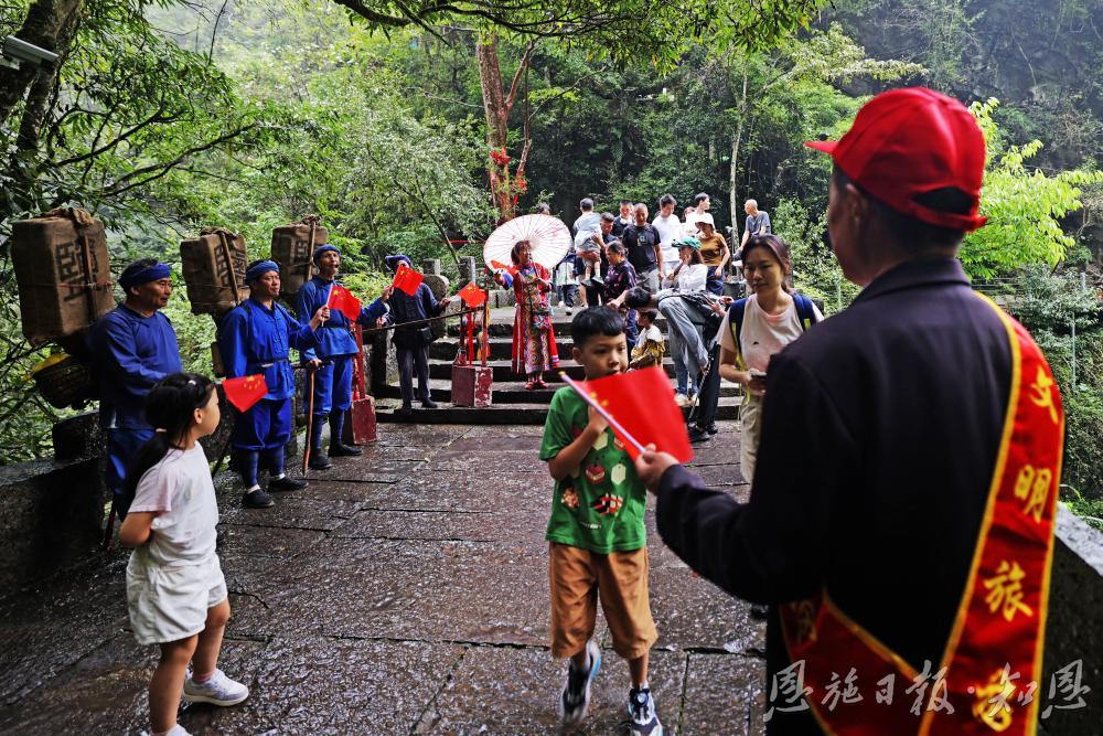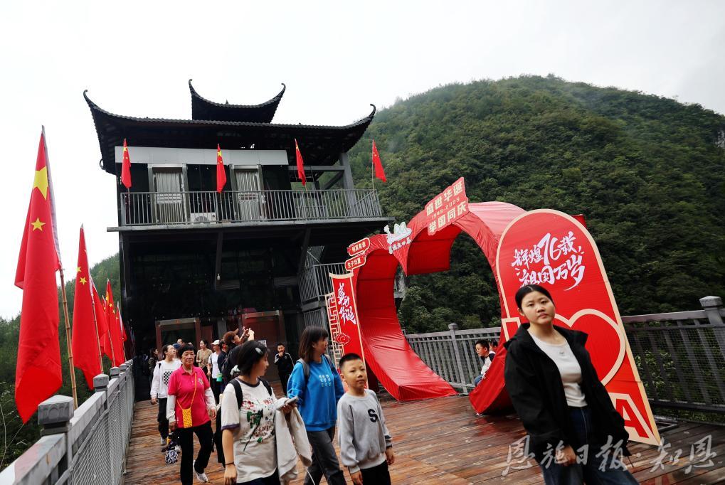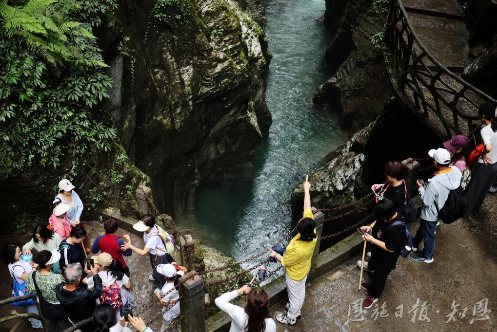 峽谷間,溪流潺潺,奇峰競秀,游客們或駐足凝望,或舉機(jī)留影,將大自然的鬼斧神工珍藏于鏡頭之中。孩子們在親水步道上歡笑嬉戲,大人們在觀景平臺上悠然小憩,處處洋溢著節(jié)日的歡愉。