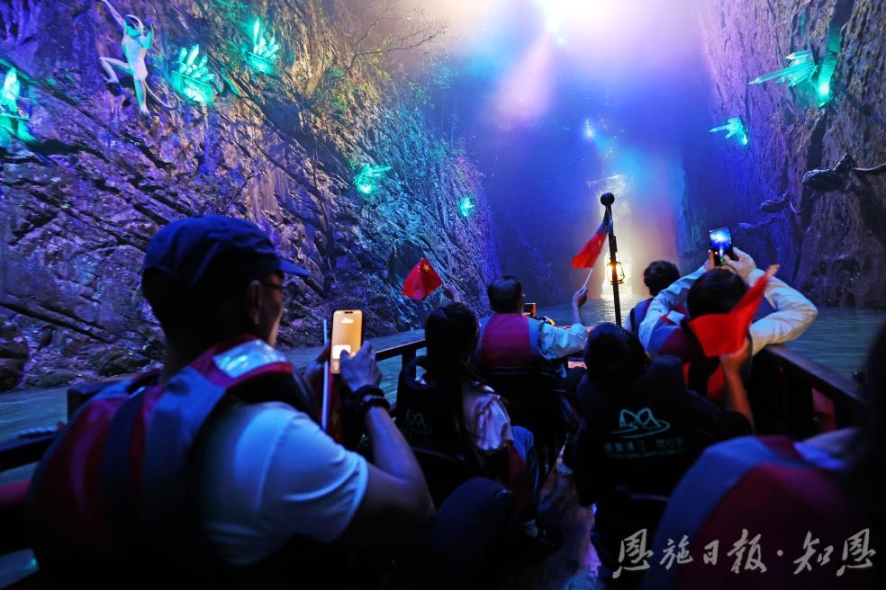 “地心奇航”作為景區(qū)全新推出的峽谷Npc王牌項目,成為這個假期恩施旅游當(dāng)之無愧的人氣明星,尤其受到家庭游客的青睞。游客們乘船緩緩潛入“中國紅”世界里的地心秘境,地心先知、鵲橋飛歌、踏浪迷航、時空裂縫、冰河時代、地心熔巖、巨獸之巢、地心烙印迷境中,沿途石幔如瀑、穹頂若星,情景交融,在清澈的地下河上享受“水陸并行”的獨特視角。