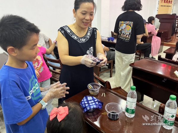 在動(dòng)手體驗(yàn)環(huán)節(jié),孩子們興致勃勃地嘗試各種扎結(jié)方法,家長(zhǎng)們?cè)谂约?xì)心協(xié)助。經(jīng)過(guò)精心捆扎與浸染,當(dāng)一塊塊布料被緩緩展開,呈現(xiàn)出獨(dú)一無(wú)二的藍(lán)白紋樣時(shí),現(xiàn)場(chǎng)響起陣陣驚嘆?;顒?dòng)不僅提升了孩子們的動(dòng)手能力與專注力,更讓他們深切感受到傳統(tǒng)技藝的魅力與勞動(dòng)的喜悅。