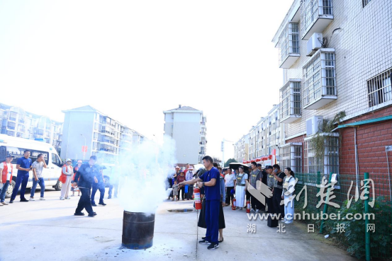 廣場一側(cè),先由湘口街道專職消防隊帶來一場沉浸式防災減災知識課。消防隊員就滅火器的性能、用途、使用方法、設(shè)備維護等基本知識進行講解,對如何正確使用消防栓、鋪設(shè)水帶進行了展示,著重講解了滅火器“一搖、二對、三撥、四壓”的操作技巧和注意事項,并指導社區(qū)居民進行滅火器實操演練?!耙郧坝X得滅火器操作很難,掌握技巧一點不難!”參加實操的居民李大爺說道。