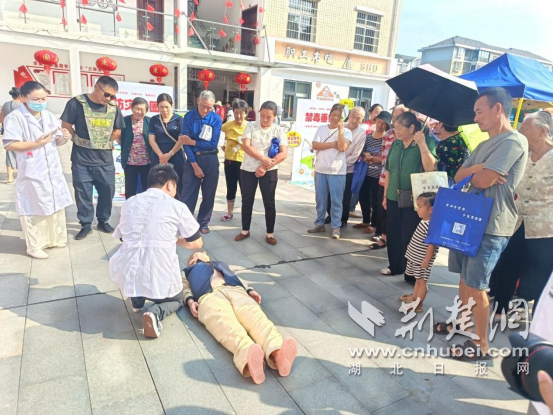 廣場另一側(cè),醫(yī)護人員鋪開模擬人體模型,演示燒傷包扎與心肺復蘇?!鞍惹鍧崅?,再用紗布從傷口下方往上層層固定,松緊度以能伸入一指為宜;做心肺復蘇時,按壓深度必須達5-6厘米,頻率保持每分鐘100-120 次,節(jié)奏就像跟著‘1001、1002’數(shù)數(shù)一樣均勻?!贬t(yī)護人員一邊說,一邊用手比劃著關(guān)鍵動作。講解完畢,邀請居民實操,遇到按壓角度偏斜、力度不足的情況,便俯身手把手糾正,耐心調(diào)整姿勢,確保每個人都能真正掌握正確要領(lǐng)。