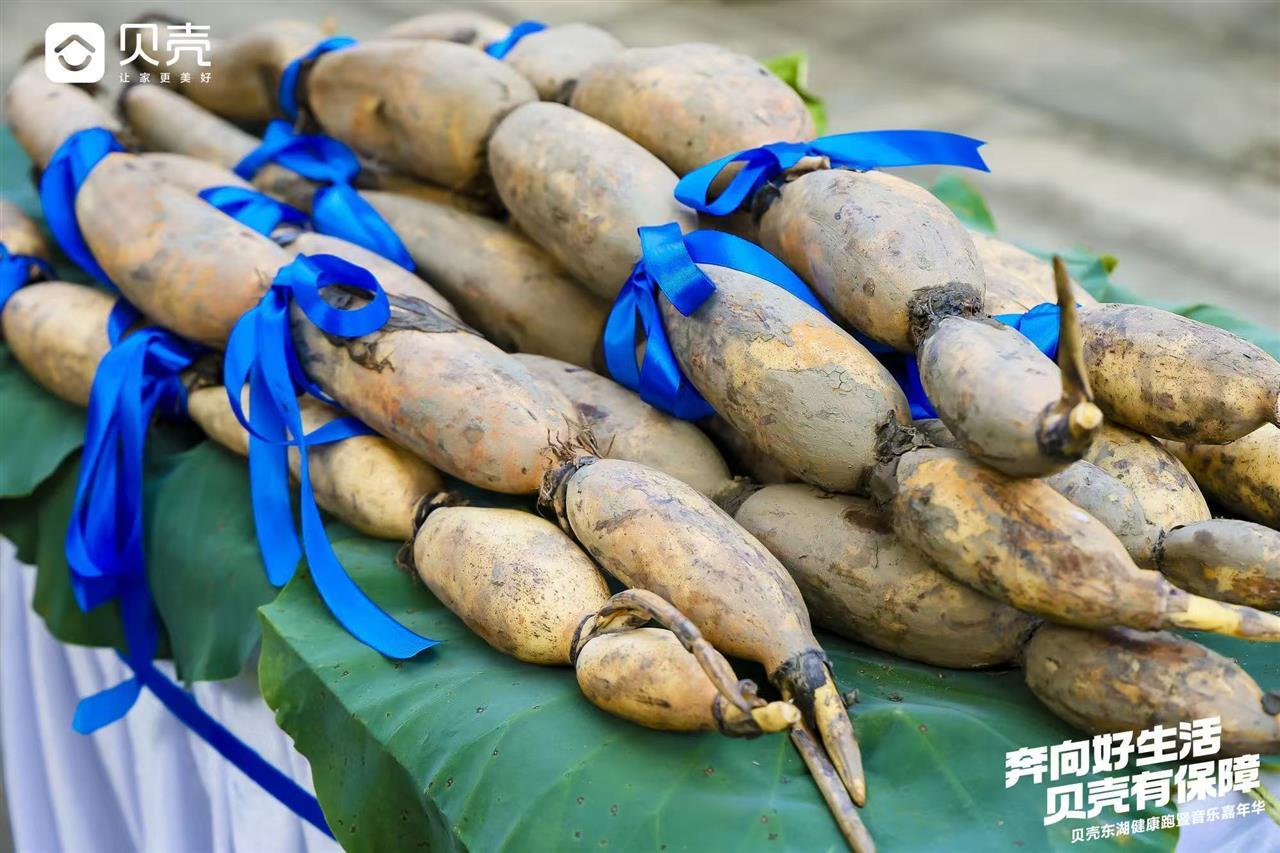 有趣的是,本次比賽為前三名選手準(zhǔn)備了迪卡儂山地自行車、王一博同款SKG腰部按摩儀器、Artsmith筋膜槍深層肌肉按摩器外,還向他們特別贈送了1根長約1.6米的蓮藕。這也是當(dāng)天剛從藕塘里挖出的新鮮野藕。這一充滿特色的獎品,寓意著“跑在東湖,暖在胃里”,讓跑友們在享受運動快樂的同時,也能感受到濃濃的江城風(fēng)味。