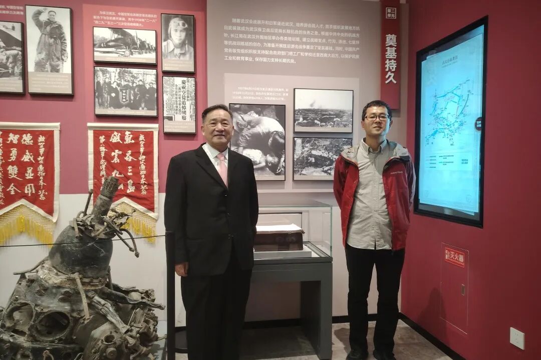 在周靜館長(zhǎng)帶領(lǐng)下,小林拓也、中國(guó)空軍勇士陳懷民烈士侄子陳德、民間收藏家代表周啟壯、武漢人文歷史愛(ài)好者袁厚翔等一行,首先參觀了基本陳列《英雄城市 抗戰(zhàn)烽火——武漢抗戰(zhàn)歷史特展》,詳細(xì)了解了全民族抗戰(zhàn)爆發(fā)后,武漢逐步成為當(dāng)時(shí)全國(guó)抗戰(zhàn)中心和武漢保衛(wèi)戰(zhàn)的相關(guān)史實(shí),以及為鞏固、發(fā)展抗日民族統(tǒng)一戰(zhàn)線,周恩來(lái)、博古、董必武、葉劍英等中國(guó)共產(chǎn)黨人在武漢所做的各種努力。