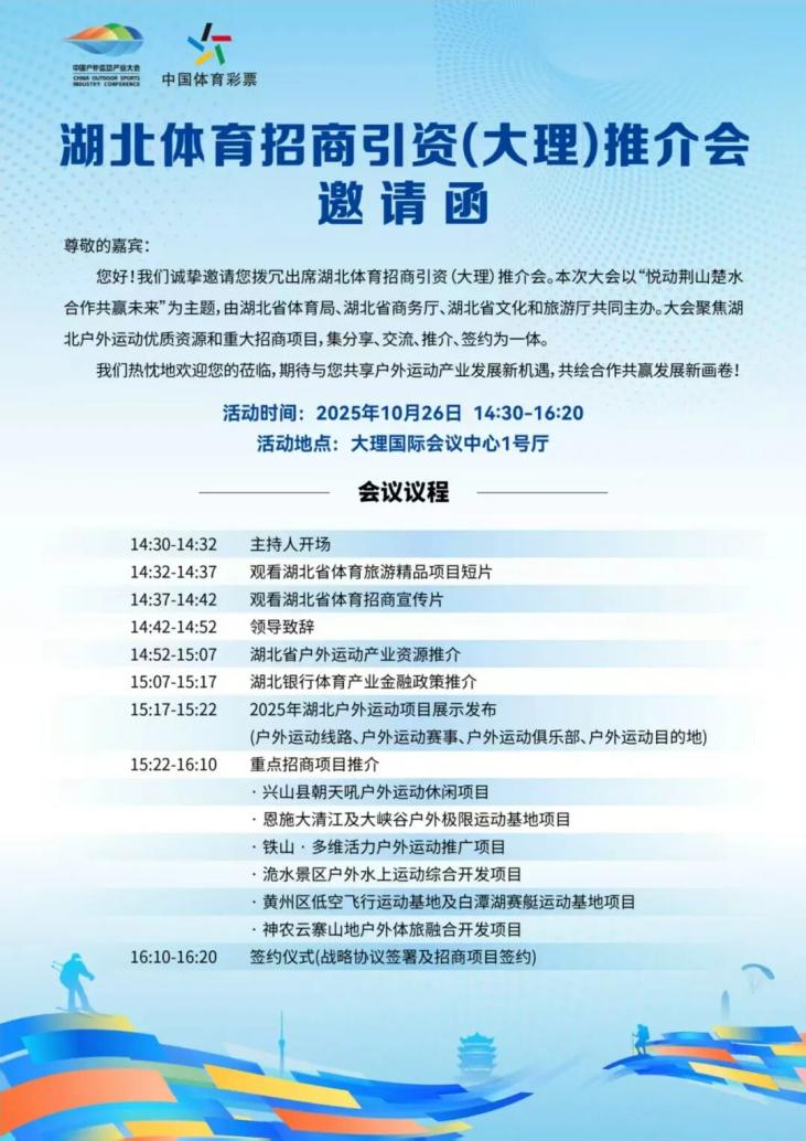 為貫徹體育產(chǎn)業(yè)高質(zhì)量發(fā)展部署,釋放湖北戶外運(yùn)動(dòng)資源優(yōu)勢(shì),搭建跨區(qū)域合作平臺(tái),由湖北省體育局、湖北省商務(wù)廳、湖北省文化和旅游廳聯(lián)合主辦的2025中國(guó)戶外運(yùn)動(dòng)產(chǎn)業(yè)大會(huì)湖北專場(chǎng)推介活動(dòng),將于10月26日14:30-16:20在云南大理國(guó)際會(huì)議中心1號(hào)廳重磅舉行。