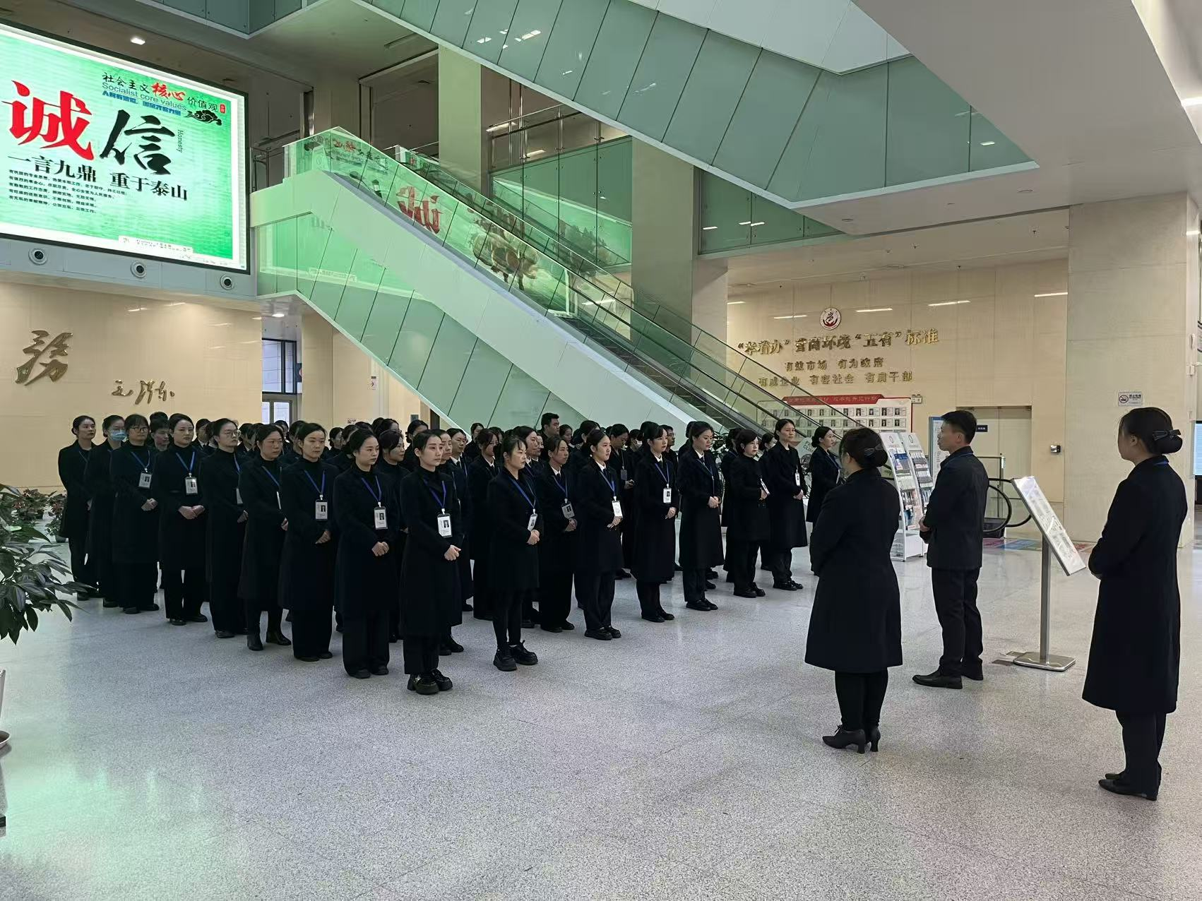 晨會上,領(lǐng)操員率先示范政務(wù)禮儀操,伴隨著規(guī)范的動作指令,88名窗口工作人員整齊列隊(duì)、認(rèn)真跟練,舉手投足間展現(xiàn)出“孝著辦”政務(wù)服務(wù)團(tuán)隊(duì)的專業(yè)風(fēng)貌,用嚴(yán)謹(jǐn)姿態(tài)為當(dāng)日服務(wù)“熱身”。