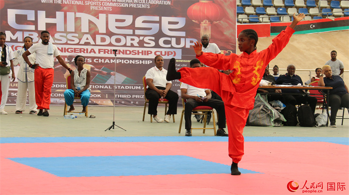 決賽活動(dòng)現(xiàn)場(chǎng),來自尼日利亞各地的武術(shù)愛好者圍繞太極、套路、男子散打、女子散打、創(chuàng)意表演、團(tuán)體比賽等六個(gè)比賽項(xiàng)目展開激烈角逐。場(chǎng)上,選手們一招一式,有板有眼,充分展示了中國武術(shù)文化蘊(yùn)含的堅(jiān)韌、拼搏精神,贏得了觀眾陣陣掌聲與歡呼聲。