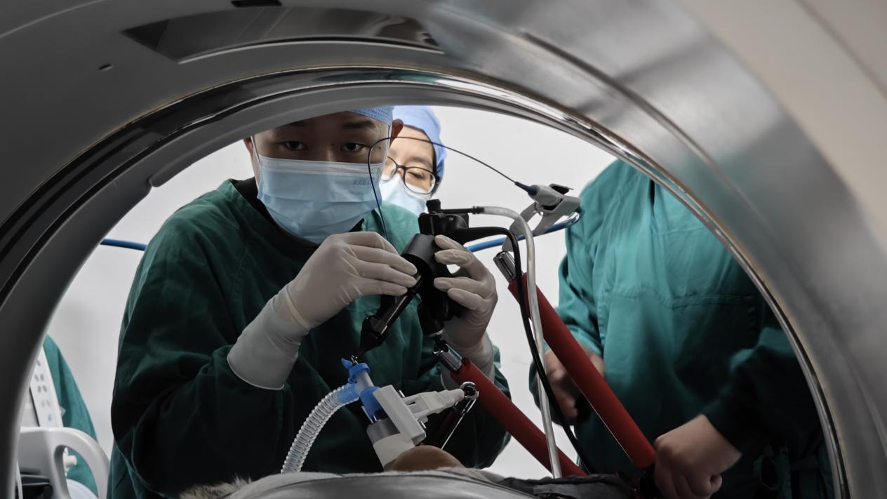 在AI+AR導(dǎo)航引導(dǎo)下,團(tuán)隊(duì)于患者目標(biāo)肺段支氣管用徑向超聲探查到實(shí)性低回聲區(qū)域,隨后通過支氣管鏡擴(kuò)張導(dǎo)管引導(dǎo)冷凍消融探頭至目標(biāo)位置。經(jīng)局部CT掃描確認(rèn)定位精準(zhǔn)后,采用“冷凍10分鐘、復(fù)溫2分鐘”的循環(huán)模式,術(shù)中最低溫度達(dá)零下156℃,最高溫度50℃,共計(jì)四個(gè)循環(huán)冷凍消融處理,復(fù)查胸部CT消融范圍基本達(dá)到預(yù)期。整個(gè)手術(shù)過程中,患者生命體征平穩(wěn),未出現(xiàn)并發(fā)癥。術(shù)后經(jīng)短期觀察,兩名患者恢復(fù)良好,均順利出院。