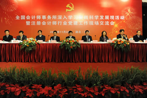11月26日,財(cái)政部會(huì)計(jì)師事務(wù)所深入學(xué)習(xí)實(shí)踐科學(xué)發(fā)展觀活動(dòng)指導(dǎo)小組、中國(guó)注冊(cè)會(huì)計(jì)師行業(yè)黨委在湖北省武漢市召開(kāi)全國(guó)會(huì)計(jì)師事務(wù)所深入學(xué)習(xí)實(shí)踐科學(xué)發(fā)展觀活動(dòng)暨注冊(cè)會(huì)計(jì)師行業(yè)黨建工作現(xiàn)場(chǎng)交流會(huì),深入學(xué)習(xí)貫徹黨的十七屆四中全會(huì)精神,總結(jié)各省市區(qū)會(huì)計(jì)師事務(wù)所學(xué)習(xí)實(shí)踐活動(dòng)和行業(yè)黨建工作做法,交流經(jīng)驗(yàn),探討方法,凝聚共識(shí),更加扎實(shí)有效地推進(jìn)會(huì)計(jì)師事務(wù)所學(xué)習(xí)實(shí)踐活動(dòng)和行業(yè)黨建工作。財(cái)政部黨組成員、副部長(zhǎng)、財(cái)政部會(huì)計(jì)師事務(wù)所深入學(xué)習(xí)實(shí)踐科學(xué)發(fā)展觀活動(dòng)指導(dǎo)小組副組長(zhǎng)、中國(guó)注冊(cè)會(huì)計(jì)師行業(yè)黨委書(shū)記王軍,湖北省委常委、常務(wù)副省長(zhǎng)李憲生出席會(huì)議并講話(huà)。
