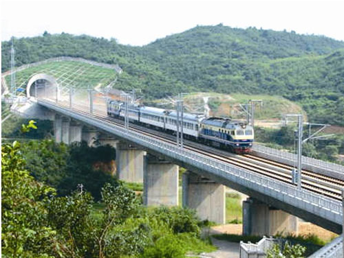 大瑤山位于湘粵交界之處,素有“南嶺險(xiǎn)關(guān)”之稱(chēng)。上世紀(jì)80年代,修建衡陽(yáng)到廣州復(fù)線(xiàn),建設(shè)者用7年時(shí)間在這里修建隧道,全長(zhǎng)14公里,是當(dāng)時(shí)國(guó)內(nèi)最長(zhǎng)的雙線(xiàn)電氣化隧道。這次,武廣客專(zhuān)的方案是修建隧道群,由1號(hào)、2號(hào)、3號(hào)隧道組成,橋隧相連。3條隧道全長(zhǎng)25公里,用了3年半全部竣工。